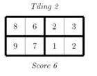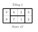 The score for Tiling 1 is 12 = (9 â 8) + (6 â 2) + (7 â 1) + (3 â 2) while the score for Tiling 2 is 6 = (8 â 6) + (9 â 7) + (3 â 2) + (2 â 1). There are other tilings possible for this grid, but you can check that Tiling 1 has the maximum score among all tilings. Your task is to read the grid of numbers and compute the maximum score that can be achieved by any tiling of the grid.